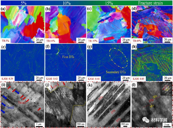 图 10.HEA样品中不同应变水平下93 K处的变形亚结构:(a-b)IPF分别图为5%,10%,15%和断裂应变,(e-h)KAM图分别为5%,10%,15%和断裂应变,(i)BSD图像显示断裂应变处的高密度次生萘,(j)和(k)BF图像在断裂应变处细胞亚结构和DTs之间的相互作用, (l) (j) 中 DTs 的放大图像。