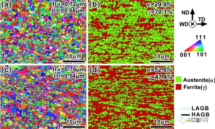 图5接收后BM的EBSD结果:(a)反孔图(IPF), (b)相图,(c)晶界图,(d) α相和γ相对应的定向角分布。