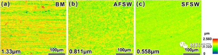 图15浸泡腐蚀试验后AFSW和SFSW接头中BM和SZs的激光扫描显微图:(a) BM。(b) AFSW, (c) SFSW。
