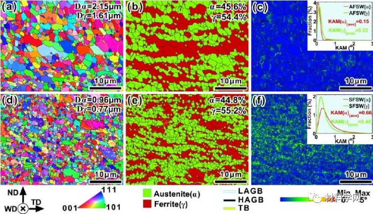 (3)除了α的CDRX和γ的CDRX和DDRX的结合外,对晶粒生长的极大抑制同时促进了SFSW SZ中UFG双相组织的形成和晶粒细化效率的提高。