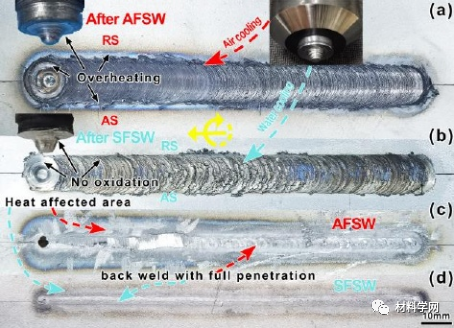 (1)与SFSW相比,有流动水的SFSW大幅降低了焊接峰值温度从1077.5°C降低到783.7°C,表面氧化程度以及SZ和TMAZ区域的尺寸,导致焊接无缺陷。