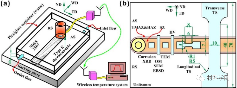 图1实验配置:(a) SFSW和无线测温系统原理图,(b)用于微结构表征和性能测试的样品制备方法。注:法向、横向和焊接方向分别定义为ND、TD和WD。