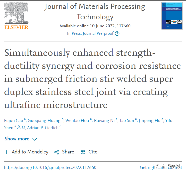 导读:本文将侵没式搅拌摩擦焊(SFSW)应用于SAF2507超双相不锈钢(SDSS)上,与传统搅拌摩擦焊相比,侵没式搅拌摩擦焊(SFSW)能显著削弱焊接热循环。在搅拌区(SZ)形成了α相(α)和γ相(γ)分布均匀、均匀的超细晶粒(UFG)双相组织,平均晶粒尺寸分别为0.96和0.77μm。这种独特的微观结构导致室温下纵向搅拌区的抗拉强度和延伸率协同增强,从AFSW条件下的840 MPa ,18%提高到915 MPa, 22%。此外,这种UFG双相微观结构在决定最终获得更高的耐腐蚀性能方面起着至关重要的作用。此外,与传统的FSW接头相比,整个接头相对较低的残余应力实际上有助于增加SFSW接头的延展性。上述结果表明,在SFSW过程中实现整个SZ的完全平衡的UFG微观结构,并同时提高强度、延伸率和耐腐蚀性能是一种有效的策略。