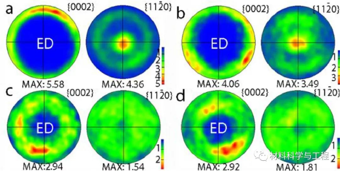 总而言之,沿挤压方向压缩Mg-Y (220MPa·μm1/2)和Mg-Gd (285MPa·μm1/2)的Hall-Petch斜率k较Mg-Al (324MPa·μm1/2)和Mg-Zn (322MPa·μm1/2)低。Zn或Al的加入形成了更强的基面织构,在挤压方向的压缩下,{10-12}孪晶变形为主要的变形方式。相反,Gd或Y的加入会使织构变弱,因此{10-12}孪晶和基面滑都被广泛激活。基面滑移较低的k值以及基面滑移对{10-12}孪晶活化的作用导致Mg-Y和Mg-Gd的k值较低。