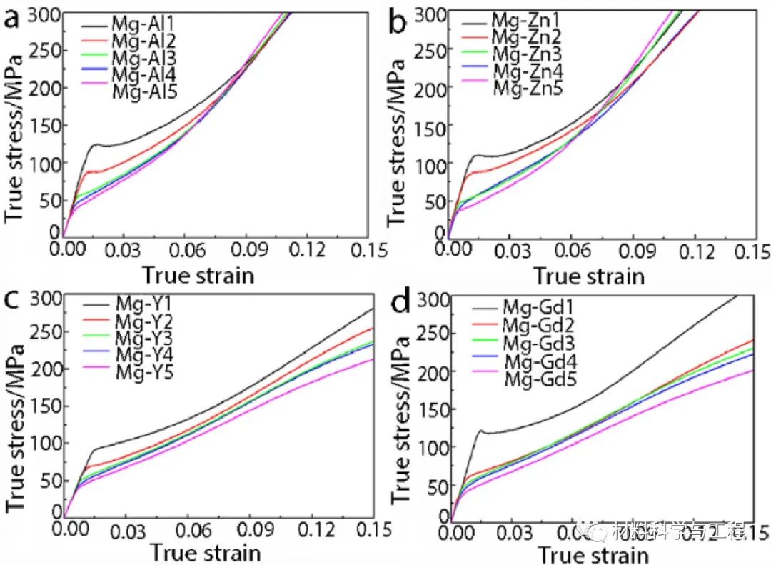图1 室温下沿ED压缩的真实应力-应变曲线:(a) Mg-Al;(b) Mg-Zn;(c) Mg-Y;(d) Mg-Gd。