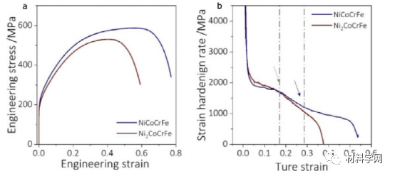 图 9。具有相似晶粒尺寸的 NiCoCrFe(~65 μm)和 Ni2CoCrFe(~84 μm)HEA 的应变硬化行为的比较。(a) 应力-应变曲线和 (b) 应变硬化率与真实应变图。