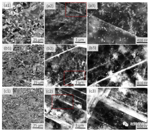 图 2。细晶粒 NiCoCrFe 的变形亚结构。(a) ~10% 应变的 ECCI 图像,(b) ~30% 应变的 ECCI 图像,和 (c) ~50% 应变的 ECCI 图像。