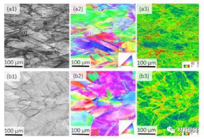 图 10。具有相似晶粒尺寸的断裂NiCoCrFe和Ni 2 CoCrFe的EBSD分析;(a1-a3) NiCoCrFe 的 IQ、IPF 和 KAM 图和 Ni 2 CoCrFe 的 (b1-b3) IQ、IPF 和 KAM 图。