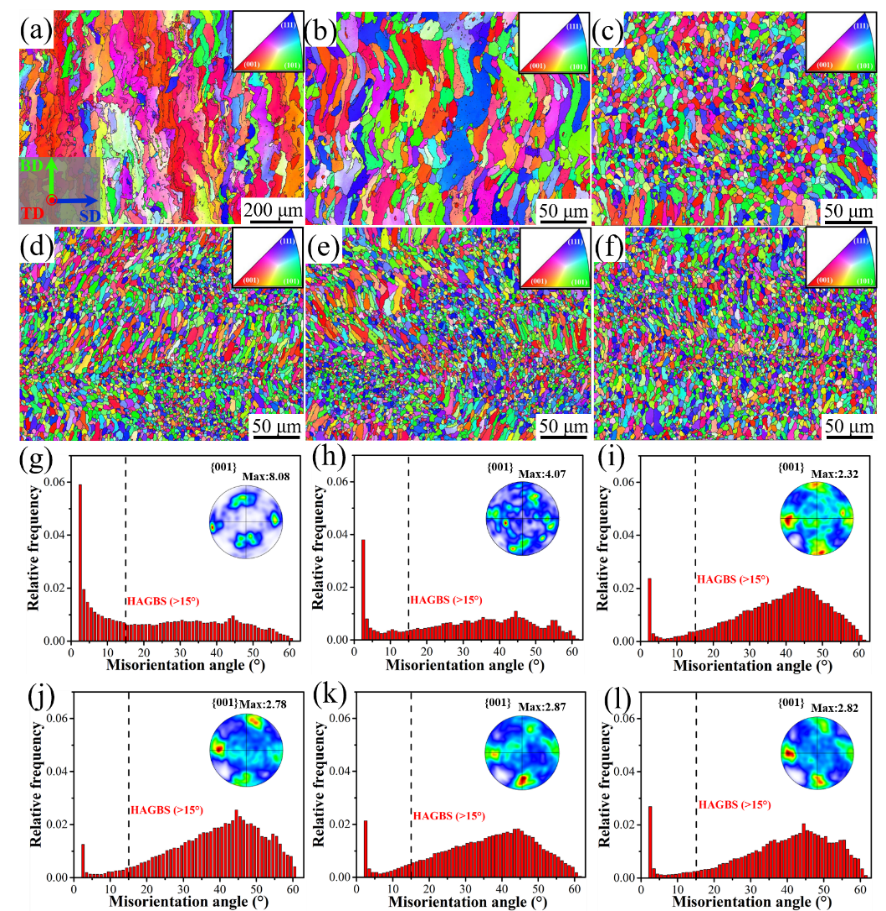 图2. (a-f)不同TiB2颗粒含量下打印态材料微观组织;(g-l)含不同TiB2颗粒打印态材料晶界分布及织构强度