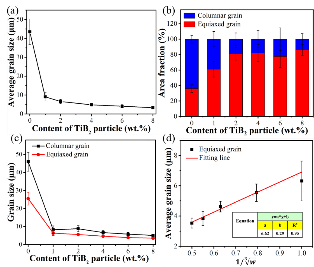图3. (a-c)试验所得不同颗粒含量打印态材料晶粒尺寸;(d)晶粒尺寸与TiB2颗粒含量拟合关系图