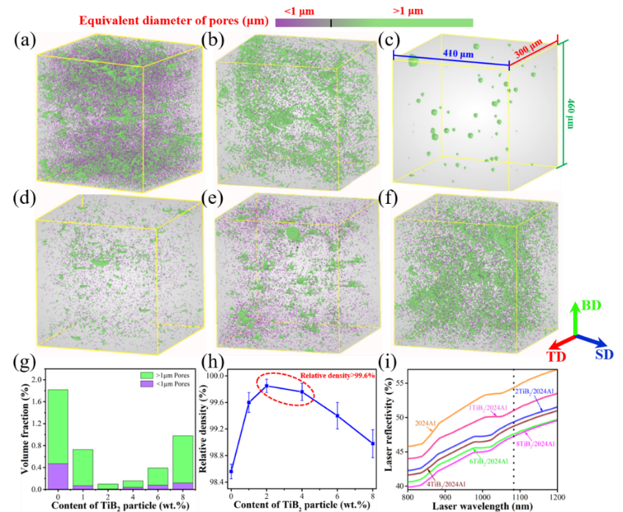 图1. (a-f)不同TiB2颗粒含量下打印态材料内部孔洞分布,(g)孔洞尺寸分布图,(h)打印态样品致密度测试结果,(i)不同颗粒含量粉末激光反射率测试结果