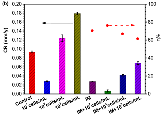 图1 不同浸泡龄期样品在不同SRB初始浓度和未掺入/掺入缓蚀剂条件下的腐蚀速率(a)浸泡七天(b)浸泡14天 © Elsevier