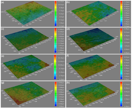 图5 腐蚀浸泡试验7天后样品去除表面腐蚀产物后的表面3D形貌:(a)无生物控制组; (b)IM; (c) 107 cells/ml; (d) 107 cells/ml + IM; (e) 105 cells/ml; (f) 105 cells/ml + IM; (g) 103个cells/ml; (h) 103 cells/ml + IM ? Elsevier