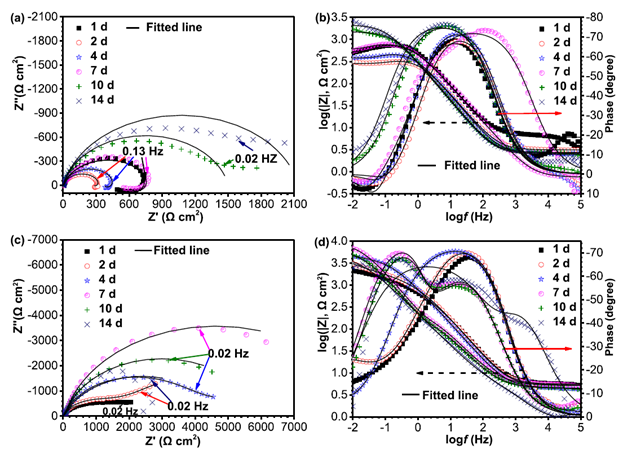 图3 不同龄期腐蚀浸泡试验样品的Nyquist(a,c,e,g)和Bode图(b,d,f,h):(a, b)无生物控制组; (c, d) 107 cells/mL; (e, f) 105 cells/mL; (g, h) 103 cells/mL ? Elsevier