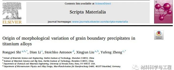 来自哈工大(深圳)等单位的研究者结合三维(3D)相场模拟和三维实验表征,采用聚焦离子束/扫描电子显微镜(FIB/SEM)形貌和晶体取向分析,研究了对晶界析出相形貌发展的影响。相关论文以题为“Origin of morphological variation of grain boundary precipitates in titanium alloys”发表在Scripta Materialia。