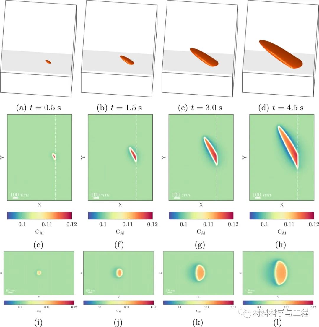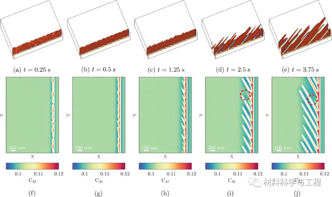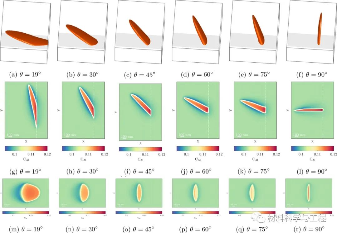 模拟结果表明,α析出相沿GBP的横向生长和由来自GBα的α板条演变之间的动态相互作用决定了最终的形貌,两者都对于θ十分敏感。随着θ的增加WS的生长优于GBα沿晶界的横向生长。因此,随着θ的增大,有一个逐渐的形貌转变,从GBα片层和WS的混合物,到一个单独的直接源于GBP的WS。根据θ的大小,两个过程可以相互竞争,也可以相互补充。例如当θ=0°时,惯习面有明显的趋势平行于GBP。这样不仅使GBα消除的晶界面积最大化,而且使弹性应变能最小化。