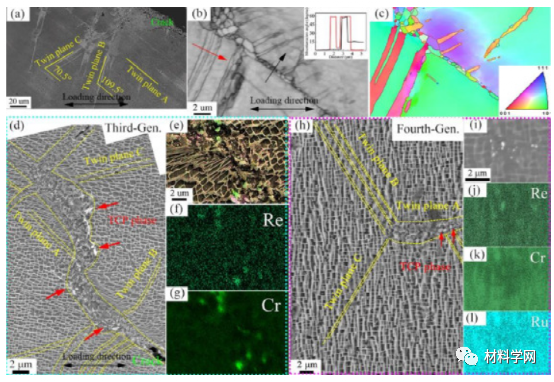 图 1。(a) 变形的第三代合金样品的背散射电子的 SEM 图像,在不同的平面上显示双胞胎,用 A、B 和 C 表示。(bc) 观察到的变形样品的菊池对比度 (b) 和欧拉角 (c) 图沿EBSD获得的 [1-10] 轴。横向于变形带(b 中的插图)的错误取向剖面对应于(b)中红色和黑色箭头表示的方向。(d, e) 显示变形结构的二次电子图像第三代合金样品纵向截面的断裂面积和 (f, g) 对应的 Re 和 Cr 元素 EDS 图。(h) 显示第四代合金样品纵向截面断裂区域变形结构的二次电子图像。(i) SEM 图像和 (j, k, l) 对应的 Re、Cr 和 Ru 元素 EDS 图,从第四代合金样品中的孪生交叉区域获得。