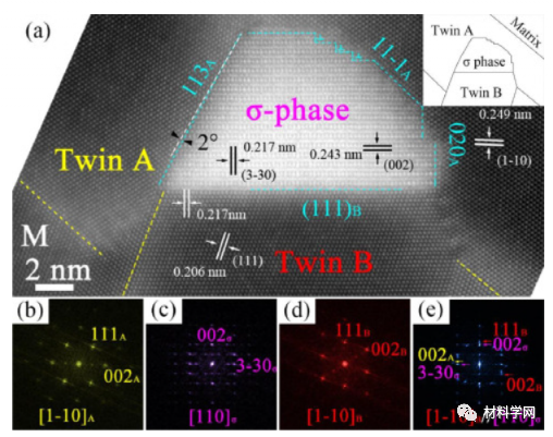 图 7。(a) 第四代高温合金中典型孪生交叉区域的 HAADF-STEM 图像。双相交区域的示意图显示为插图。(be)从双胞胎 A (b)、σ 相 (c)、双胞胎 B (d) 单独和所有双胞胎 A、σ 相、双胞胎 B (e) 获得的功率谱。