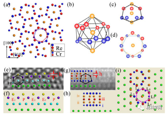 图 12。(a) 沿 [001] σ轴观察的 σ 相的原子结构。(b) 重叠的红色和蓝色六边形与中心橙色球体相结合,说明了 σ 相的特征结构。(c) 沿 [110] σ轴的 σ 相的侧视图。(d) 沿 [001] σ轴的 σ 相俯视图, σ 相 (Cr 2 Re 3 ) 的键长为 248,Cr-Re 键为 263 pm,Cr-Cr 键为 254 pm。(e) Σ9{111} 边界沿[1-10] γ轴的侧视图和 (f) 示意图,绿色球体表示孪晶 B 侧的原子,黄色和紫色球体表示孪晶 A 侧的原子. (g) {111} B的侧视图沿 [1-10] γ轴观察的孪晶 B 和 σ 相之间的相干界面和 (h) 示意图,以及 (i) 沿 σ 相的 [001] σ轴观察的界面顶视图(也是 [ 1-10] γ轴),其中{111} B中Ni原子之间的距离为L 1 : 249, L 2 : 249, L 3 : 249, L 4 : 249, L 5 : 249, L 6 : 249 pm。