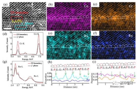 图 11。(a) HAADF-STEM 图像显示第四代合金中孪晶交叉处的 Σ9{111} 边界。红色和青色框表示获得 (d, g) 中的 EDS 光谱的位置。(bc, ef) 从 Σ9{111} 边界获取的 HAADF-STEM 图像和 Co、Cr、Ru 和 Re 元素图的叠加。(d, g) Σ9{111} 边界(红色框)及其相邻 γ' 相(青色框)的 EDS 光谱。(h, i) 从 Σ9{111} 边界的相应 EDS 图确定的元素分数的线剖面。