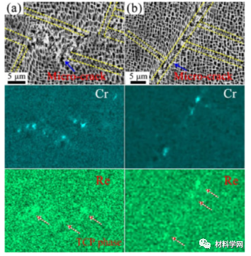 图 3。(a) 在第三代合金中发生再结晶的孪晶相交处形成的 TCP 相的 SEM 图像和 EDS 图。(b) 第三代合金中直接在孪晶交叉处形成的 TCP 相的 SEM 图像和 EDS 图。