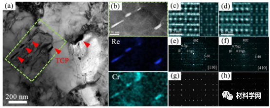 图 5。(a) 再结晶区域的明场TEM图像。TCP相的沉淀颗粒用红色箭头表示。(b) 沉淀颗粒的 HAADF-STEM 图像和 EDS 分析。(cd) 分别沿 [110] 和 [410] 区域轴观察的 TCP 相的 HAADF-STEM 图像。沿 [110] (c) 和 [410] (d) 轴的模拟 HAADF-STEM 图像显示为由白色虚线框勾勒的插图。(ef)从傅里叶变换获得的沿 [110] (e) 和 [410] (f) 区域轴的 HAADF-STEM 图像的功率谱。(gh)沿[110](g)和[410](h)轴的σ相模拟电子衍射图。