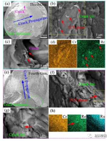 图 2。(a) 第三代合金断口的 SEM 图像。(bc) 第三代合金断面的背散射电子高倍扫描电镜图像。(d) 通过 EDS 分析从 (b) 中黄色虚线框勾勒的区域获得的 Cr 和 Re 元素图。(e) 第四代合金断口的 SEM 图像。(fg) 第四代合金断面的背散射电子高倍 SEM 图像。(h) 通过 EDS 分析从 (f) 中黄色虚线框勾勒的区域获得的 Cr、Re 和 Ru 元素图。