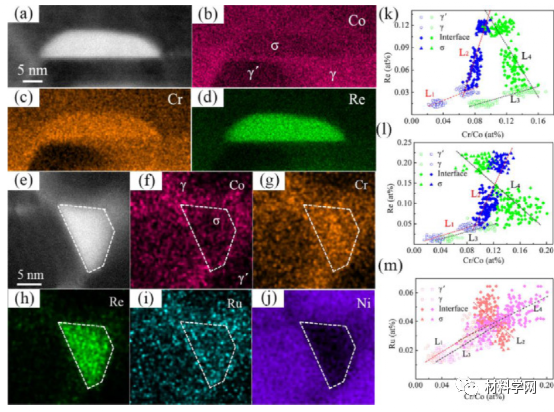 图 9。双相交点处 σ 相粒子的 HAADF-STEM 图像和区域的 EDS 映射。(ad) 第三代合金中的σ相颗粒。(ej) 第四代合金中的σ相粒子。(km) Re/Ru和Cr/Co在不同区域(γ′、γ、σ/基体界面、σ相)的相关性,各个元素的含量由各自的EDS图确定。γ′、γ和σ相中元素Cr、Co、Re和Ru之间关系的线性拟合值和相关系数列于表S7和S8中。