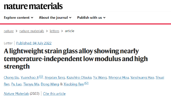 相关研究成果以题“A lightweight strain glass alloy showing nearly temperature-independent low modulus and high strength”发表在《自然·材料》(Nature Materials)上。