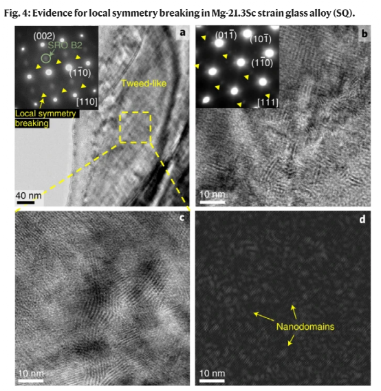 图4 Mg-21.3Sc应变玻璃合金(SQ)中局部对称性破缺的证据。a,室温下具有[110]β区轴的粗花呢状形态。b,具有[111]β区轴的明场图像和相应的衍射图案。c,a中放大的花呢状区域显示了bcc晶格的局部晶格畸变。d,通过选择所有1/2{112}超晶格反射获得的c的快速傅里叶逆变换图像。