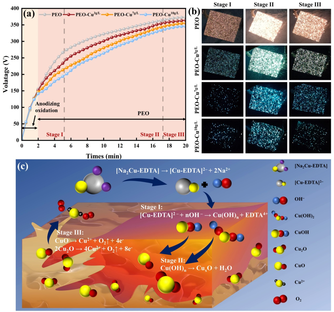 图1. CuxO/TiO2膜层的形成过程表征及示意图:(a) 时间-电压曲线;(b) PEO过程中的等离子体放电图像;(c) CuxO相掺入TiO2层的机理示意图。