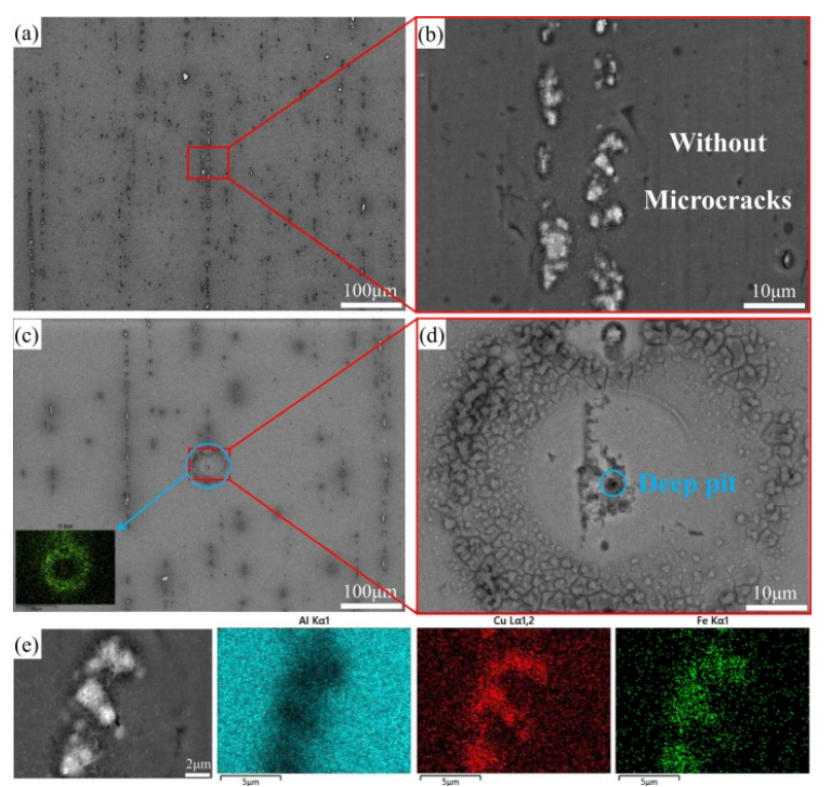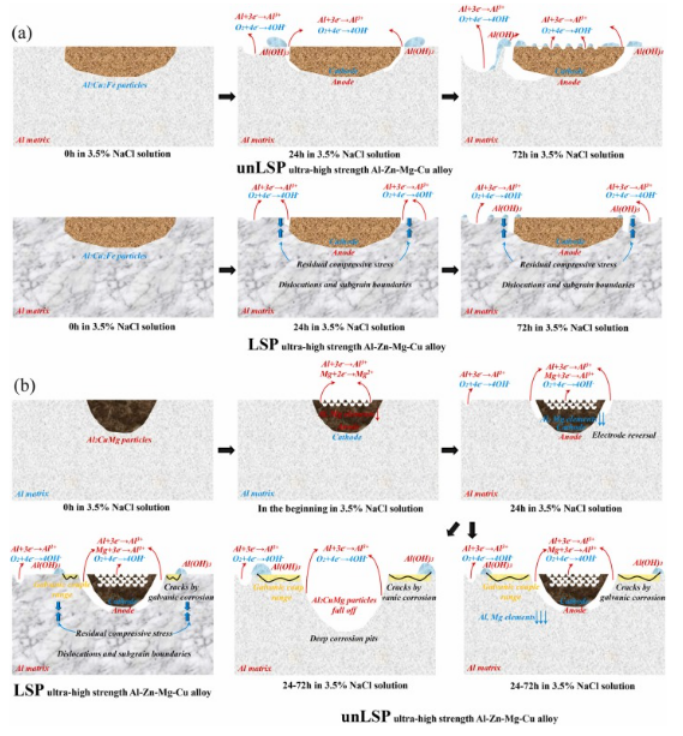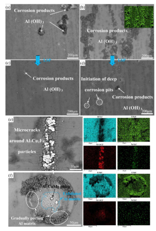 (3)点蚀主要发生在Al基体、Al 7 Cu 2 Fe和Al 2 CuMg颗粒中。最严重的点蚀是由Al 2 CuMg 颗粒引起的,这种颗粒的数量可以通过喷涂成型工艺减少。LSP 引入的位错、层错、滑移线和亚晶界可以为快速形成连续和保护性钝化膜创造大量位点。