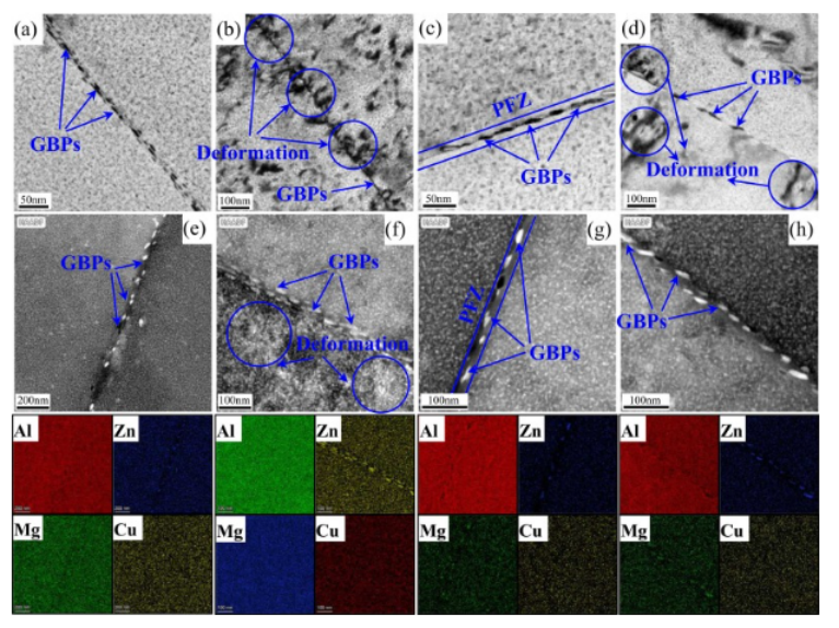 图 15。不同合金中晶界的明场、HAADF-STEM图像和EDS结果:(a)和(e)SF-SA-unLSP合金;(b) 和 (f) SF-SA-LSP 合金;(c) 和 (g) SF-RRA-unLSP 合金;(d) 和 (h) SF-RRA-LSP 合金。