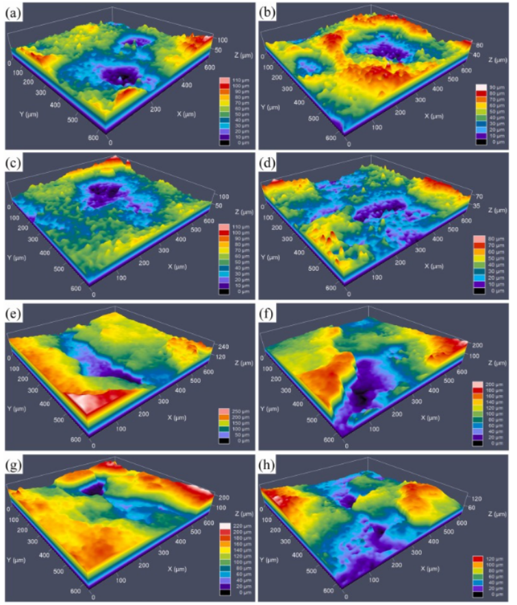 图 8。EXCO测试后通过 LSCM 获得的合金的 3D表面形貌:(a)SF-SA-unLSP;(b) SF-SA-LSP;(c) SF-RRA-unLSP;(d) SF-RRA-LSP;(e) IM-SA-unLSP;(f) IM-SA-LSP;(g) IM-RRA-unLSP;(h) IM-RRA-LSP。