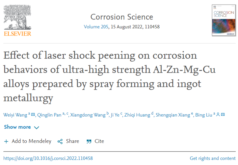 相关研究成果以题“Effect of laser shock peening on corrosion behaviors of ultra-high strength Al-Zn-Mg-Cu alloys prepared by spray forming and ingot metallurgy”发表在增材制造顶刊Corrosion Science上。
