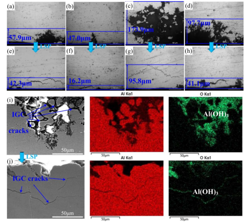 图 7。IGC测试后研究合金的最大深度和形貌:(a)SF-SA-unLSP;(b) SF-RRA-unLSP;(c) IM-SA-unLSP;(d) IM-RRA-unLSP;(e) SF-SA-LSP;(f) SF-RRA-LSP;(g) IM-SA-LSP;(h) IM-RRA-LSP;(i) 和 (j) 分别对 IM-SA-unLSP 和 IM-SA-LSP 样本进行 EDS 分析。