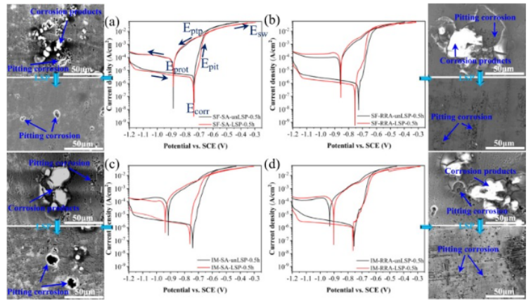 图 9。有和没有 LSP 处理的样品的循环极化曲线和相应的形态图像:(a)SF-SA 样品;(b) SF-RRA 样本;(c) IM-SA 样本;(d) IM-RRA 样本。