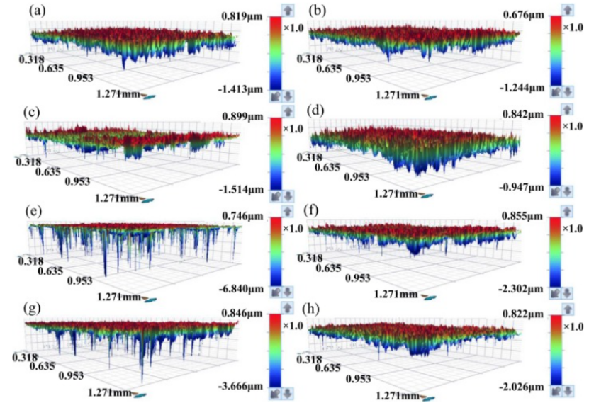 图3 . 在 3.5% NaCl 溶液中浸泡 24 h 后的腐蚀坑深度:(a) SF-SA-unLSP;(b) SF-SA-LSP;(c) SF-RRA-unLSP;(d) SF-RRA-LSP;(e) IM-SA-unLSP;(f) IM-SA-LSP;(g) IM-RRA-unLSP;(h) IM-RRA-LSP。
