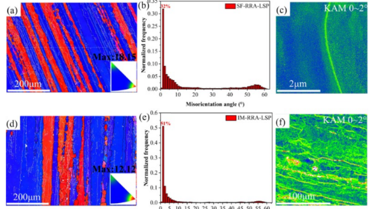 图 16。LSP处理后研究合金的EBSD分析:(a)和(d)SF-RRA-LSP和IM-RRA-LSP样品的IPF图像和反极图;(b) 和 (e) (a) 和 (d) 的方向错误角分布;(c) 和 (f) SF-RRA-LSP 和 IM-RRA-LSP 样本从 0° 到 2° 的 KAM 图像。