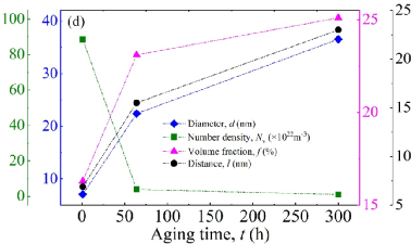 图 2. (NiCoCr)92Al6Ta2中熵合金时效不同时间后纳米相形貌演化及纳米相特征(尺寸、数密度,体积分数和间距)统计结果。