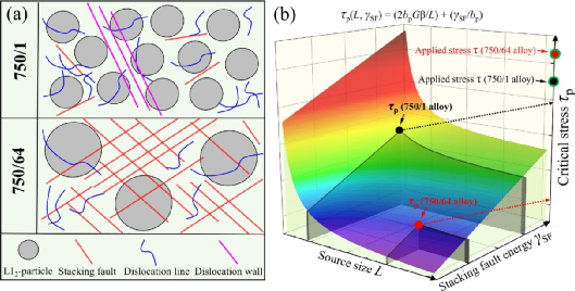 (2) 发现材料基体的变形机制呈现出一种纳米颗粒特征的依赖性。具体而言,当颗粒尺寸较小、密度较高、间距较窄时,材料的变形机制以平面位错滑移为主;而当纳米颗粒尺寸较大、密度较低、间距较宽,大量层错主导基体变形,这也导致材料较高的加工硬化能力。这种变形机制的转变是基体层错能差异、外加应力以及不同间距约束效应耦合作用的结果。这一发现也为通过改变纳米强化相特征而调控金属材料变形机制并进一步优化力学性能提供了一种新的思路;