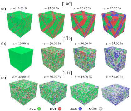图4.(a)-(c)不同加载晶向(图片)的相变行为。