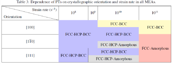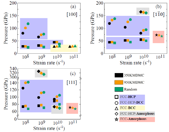 导读:本文利用大规模分子动力学模拟,通过准等熵压缩加载对CoCrNi多主元合金的相变路径展开系统研究。研究表明,多主元合金的相变行为与加载晶向、应变率、压力以及内部化学短程序结构等因素密切相关。其中,沿图片晶向加载,化学短程序在变形初期诱导产生的异常体心立方(BCC)团簇结构使得材料的初始塑性行为与应变率无关。而沿图片 晶向加载的结果则表明高应变率可诱导材料发生固态非晶化转变。多重相变路径的存在与相互竞争不仅凸显出多主元合金的多态性,同时也为满足极端服役环境的材料性能提升提供了新的调控思路。