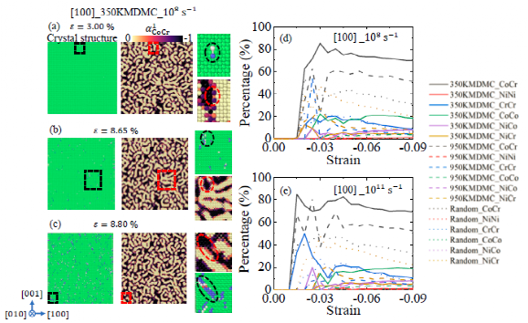 图3. (a)-(c)沿图片加载,材料变形初期的晶体结构和化学短程序分布;(d)-(e)不同应变率下,材料变形初期BCC团簇中的不同原子对占比。