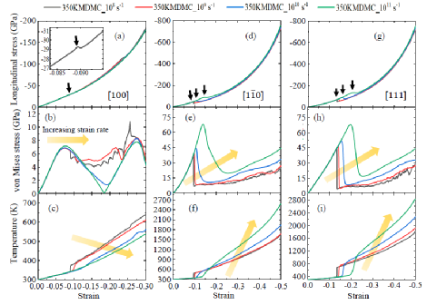 图2.不同加载晶向(图片)在不同应变率(图片—图片)压缩过程中的应力变化与温升。