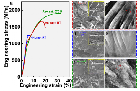 图 7。(a) 合金样品在不同条件下的典型压缩工程应力-应变曲线,即在室温下测试的铸态 (As-cast, RT) 和均质化 (Homo, RT) 样品,以及在 673 K 下测试的铸态样品(铸态,673 K)。(bg) 不同样品的断裂形态:(b, c) 铸态,RT;(d, e) 人,RT;(f, g) 铸态,673 K。“Homo”是指“均质化条件”。