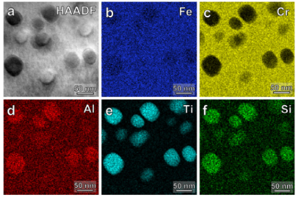 图 4。(a) 铸态样品中典型晶粒内部区域的 HAADF-STEM 图像。(b-f) 元素(即 Fe、Cr、Al、Ti 和 Si)的相应 STEM-EDS 图。