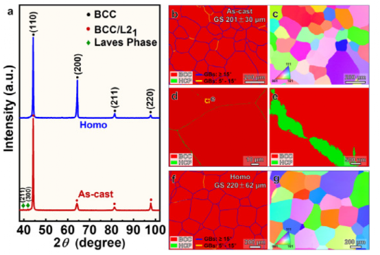 图 1。(a) 铸态和均质化样品的 XRD 图谱。(b, f) 铸态 (b, c) 和均质化 (f, g) 样品的 EBSD 相图覆盖晶界和 (c, g) 反极图 (IPF) 图。(d, e) 放大的 EBSD 相图,显示铸态样品中 GB 区域的 HCP Laves 相。“Homo”、“GS”和“GBs”分别是指“均质状态”、“晶粒尺寸”和“晶界”。