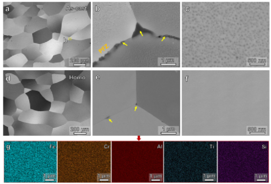 图 2。(a-c) 铸态和 (d-f) 均质合金样品的 BSE 图像。(g) (e) 中样品区域的 SEM-EDS 图。沿晶界分布的 Laves 相用黄色箭头标记。“PFZ”是指“无沉淀区”。