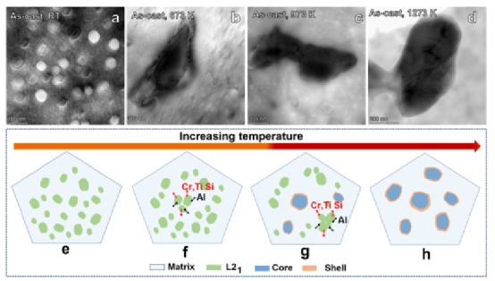 图 13。(a) 铸态合金样品的 STEM-BF 图像,以及加热到 (b) 673 K、(c) 973 K 和 (d) 1273 K 然后进行水淬的铸造样品。(eh) 示意图揭示了加热时的微观结构演变。